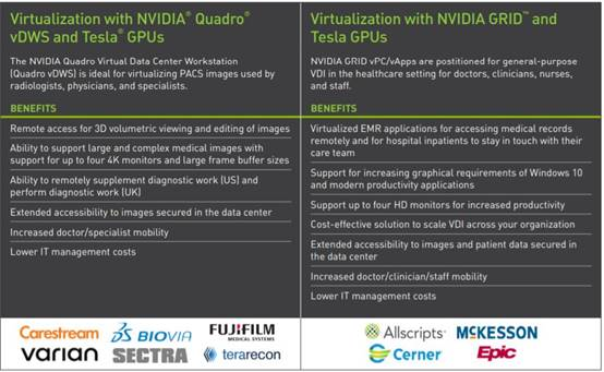 Digital transformation for healthcare providers is driving deep VDI penetration within the industry at lower costs while enabling improved security. However, many of these traditional VDI solutions did not include GPU virtualization and are challenged to keep up with today’s more graphics-intensive applications. By adding NVIDIA GPU virtualization solutions to their VDI environments, healthcare organizations gain significant benefits, including improved performance and increased productivity.