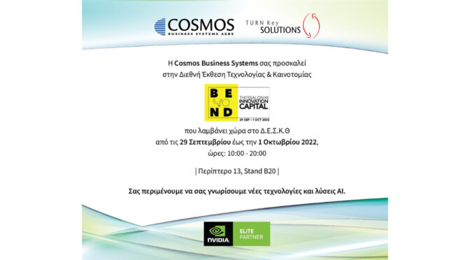 Η Cosmos Business Systems συμμετέχει στην Διεθνή Έκθεση Τεχνολογίας & Καινοτομίας “Βeyond 2022” που πραγματοποιείται στην Θεσσαλονίκη από τις 29 Σεπτεμβρίου έως 1η Οκτωβρίου και βρίσκεται στο περίπτερο Β20, στον χώρο της Δ.Ε.Θ, με μια σειρά παράλληλων δράσεων, εντός και εκτός της έκθεσης.