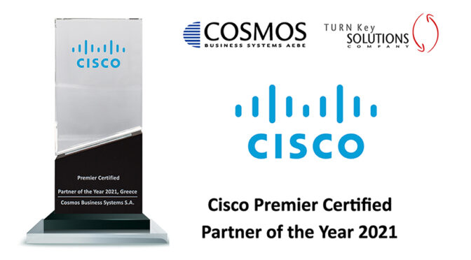 Για την εξαιρετική της επίδοση το 2021, η Cosmos Business Systems βραβεύτηκε ως «Premier Certified Partner of the Year Greece» από την εταιρεία Cisco, στην παροχή ολοκληρωμένων και υψηλής ποιότητας λύσεων και υπηρεσιών στον τομέα των δικτύων και των επικοινωνιών.