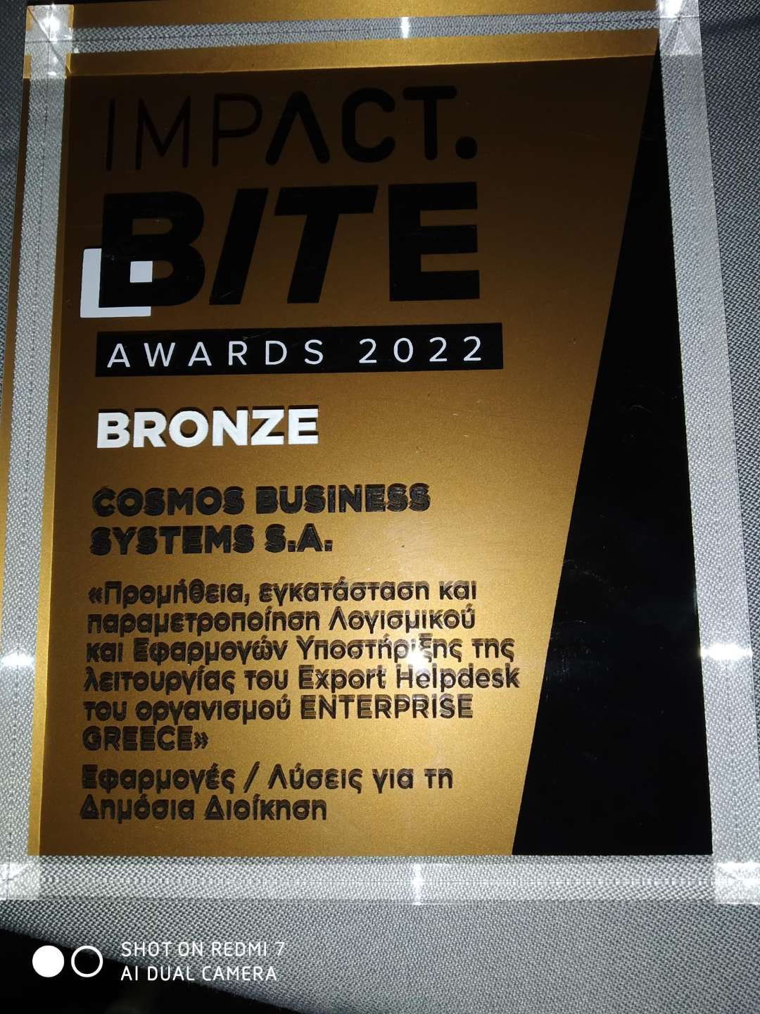 H Cosmos Business Systems έλαβε το BRONZE βραβείο στα Bite Awards για το έργο «Προμήθεια, εγκατάσταση και παραμετροποίηση Λογισμικού και Εφαρμογών Υποστήριξης της λειτουργίας του Export Helpdesk του οργανισμού ENTERPRISE GREECE» στην κατηγορία «Εφαρμογές / Λύσεις για τη Δημόσια Διοίκηση», στην τελετή απονομής που πραγματοποιήθηκε στο Μουσείο Οίνου – Markou Wine Museum.